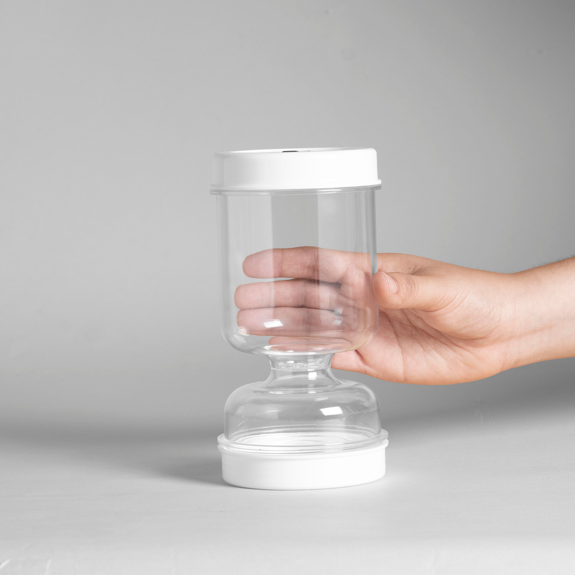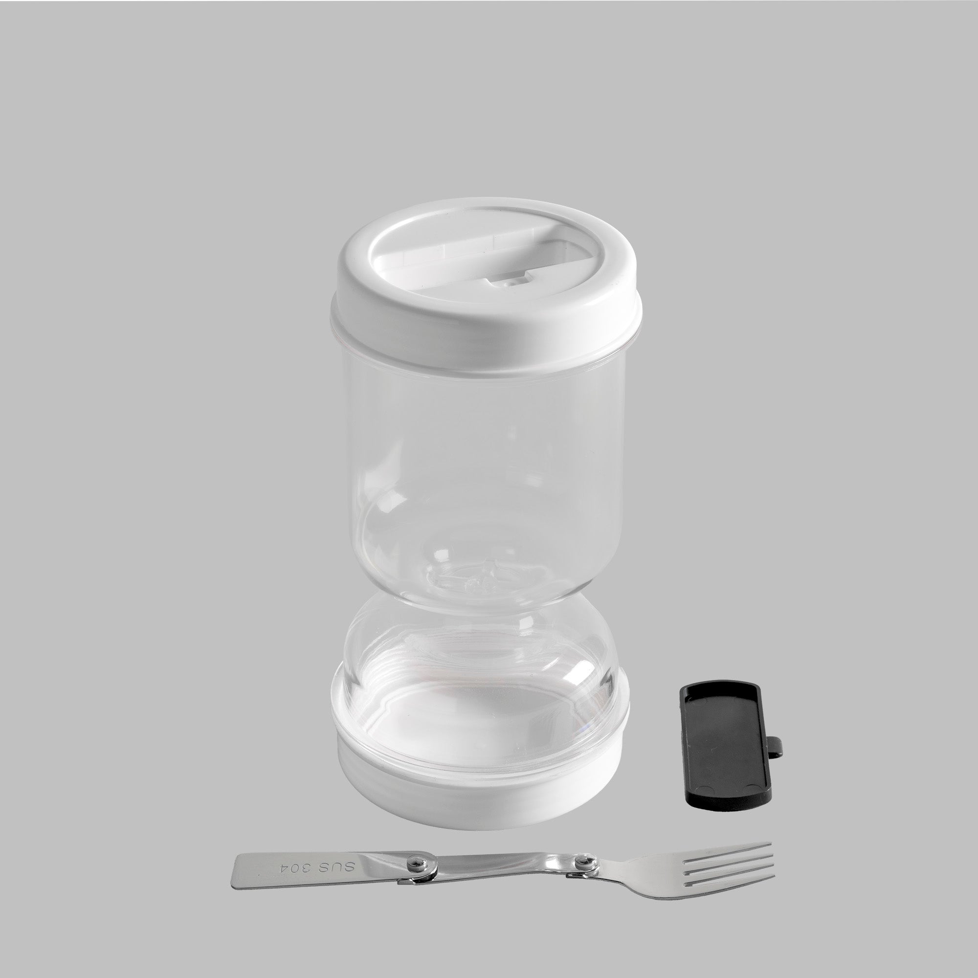 Contenedor práctico que separa alimentos de líquidos con solo voltearlo; incluye un tenedor para servir fácilmente sin ensuciarte.