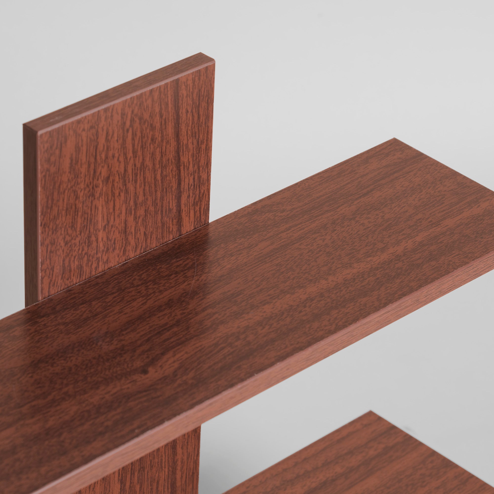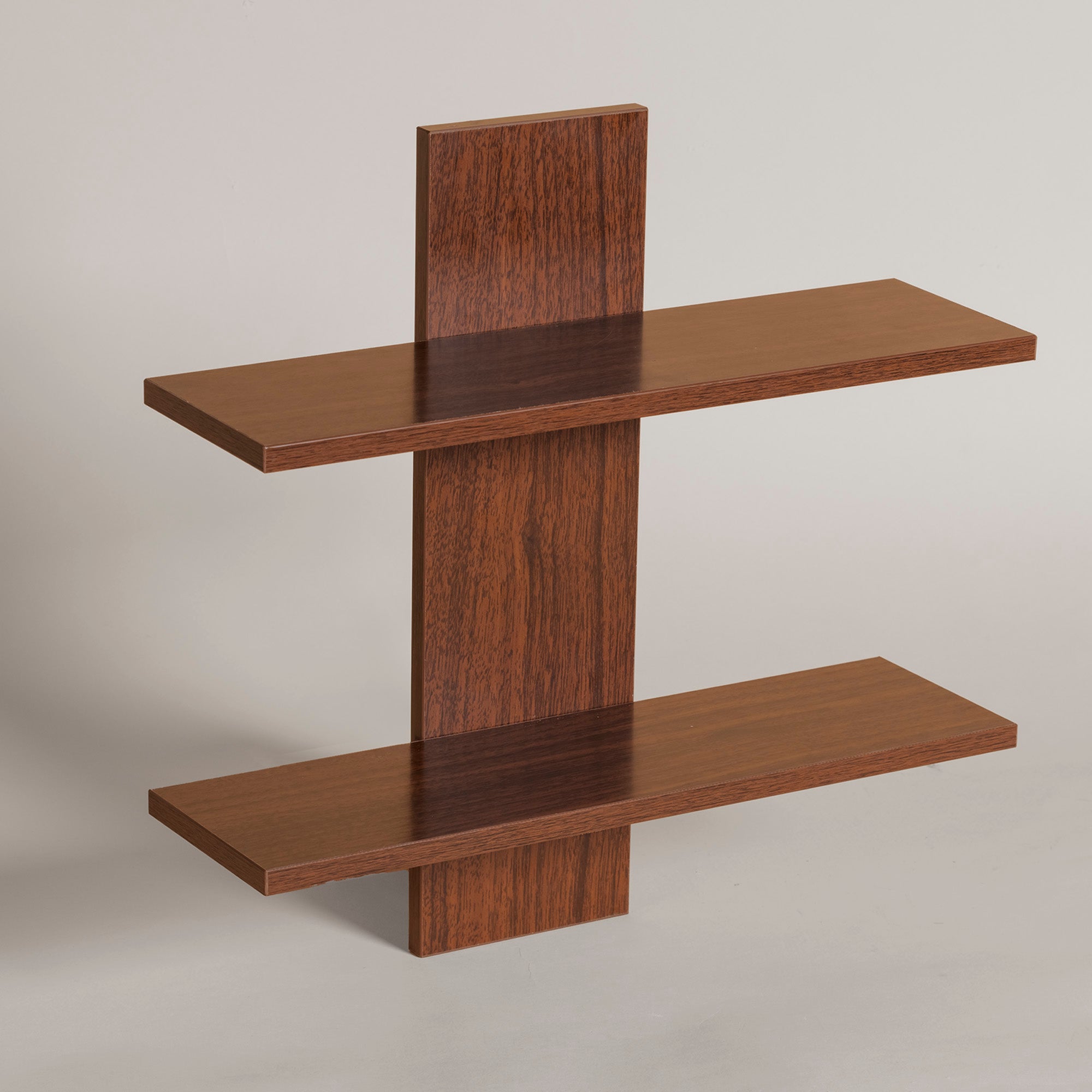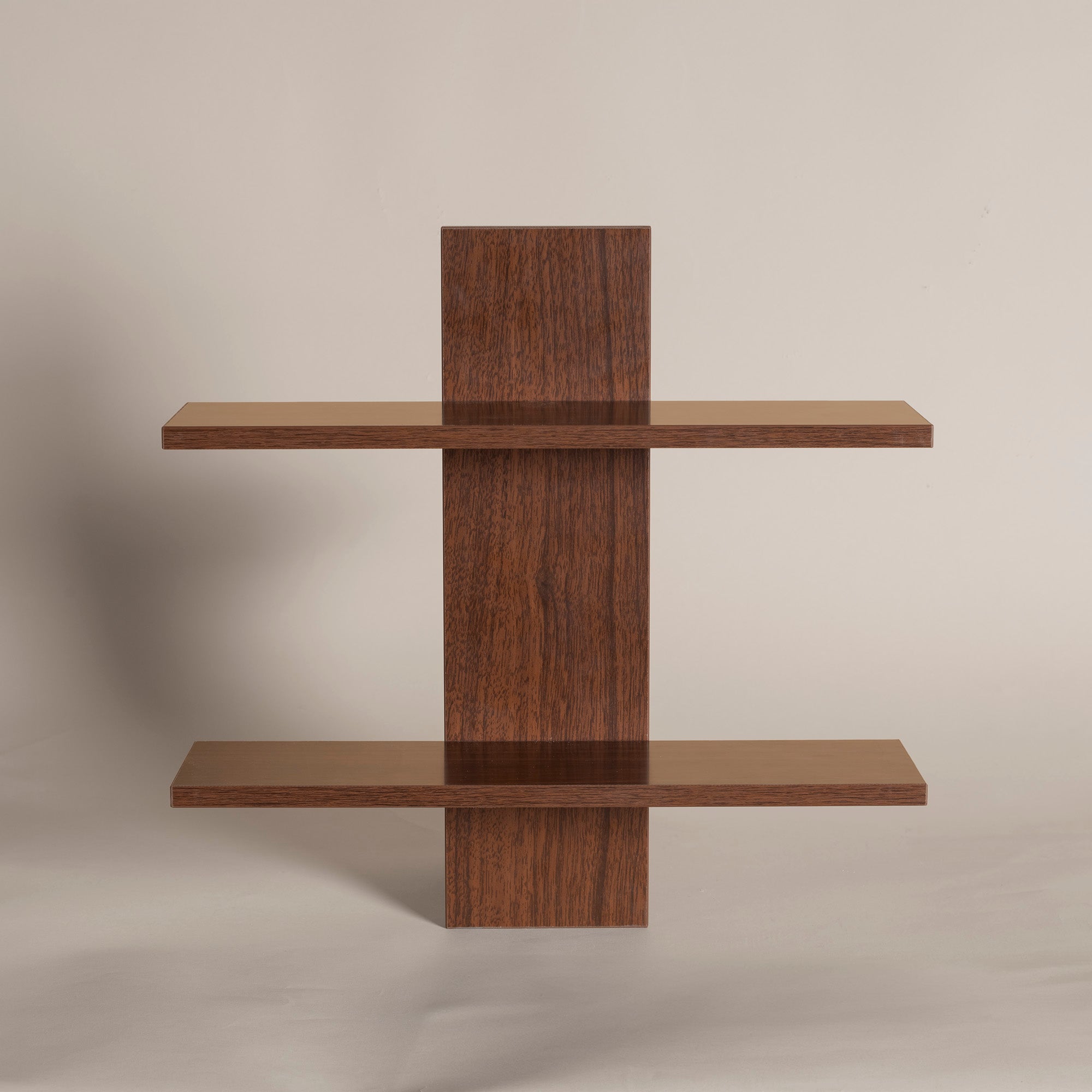 Repisa de dos niveles y acabado en nogal, aporta profundidad y dinamismo a cualquier espacio. Ideal para exhibir tus objetos favoritos.