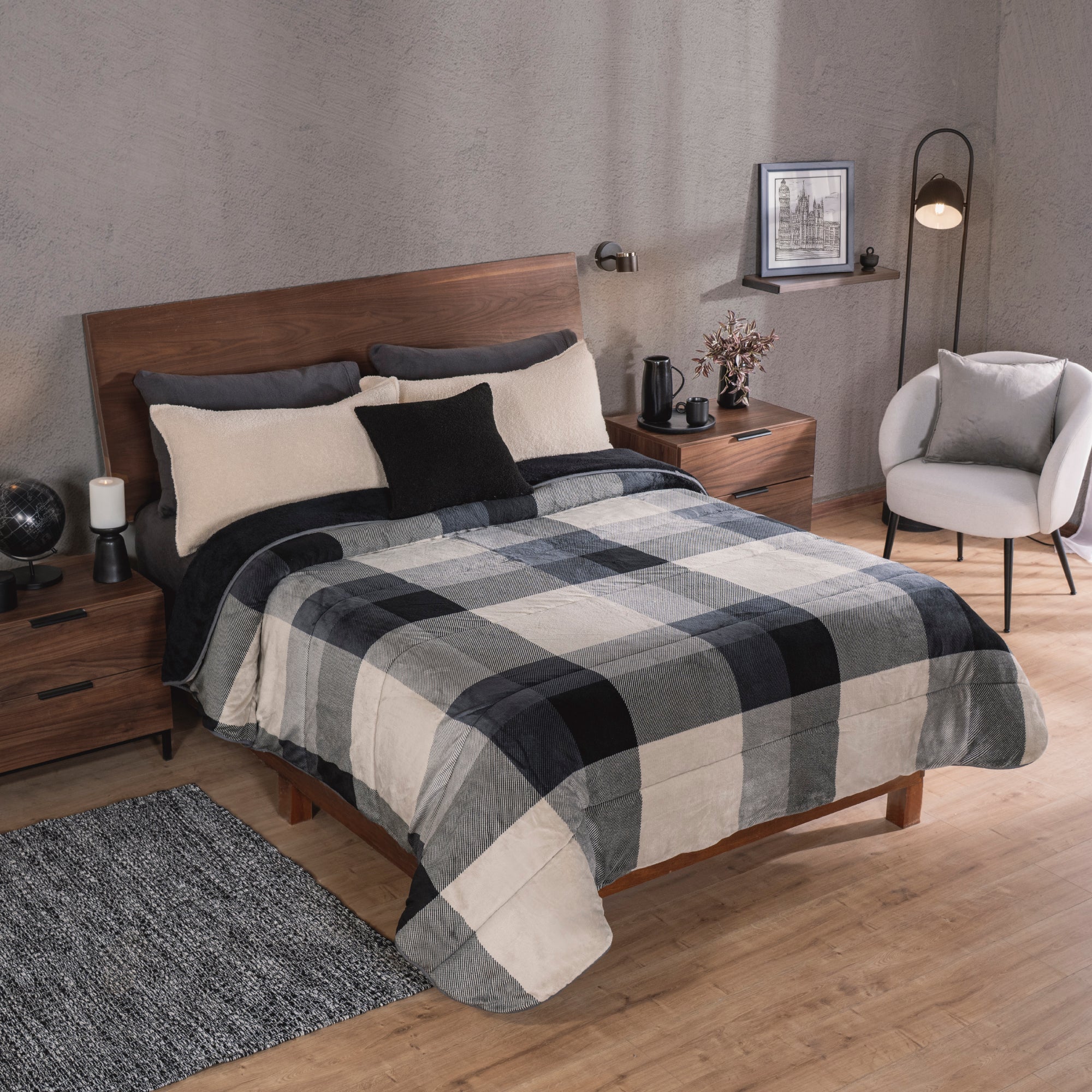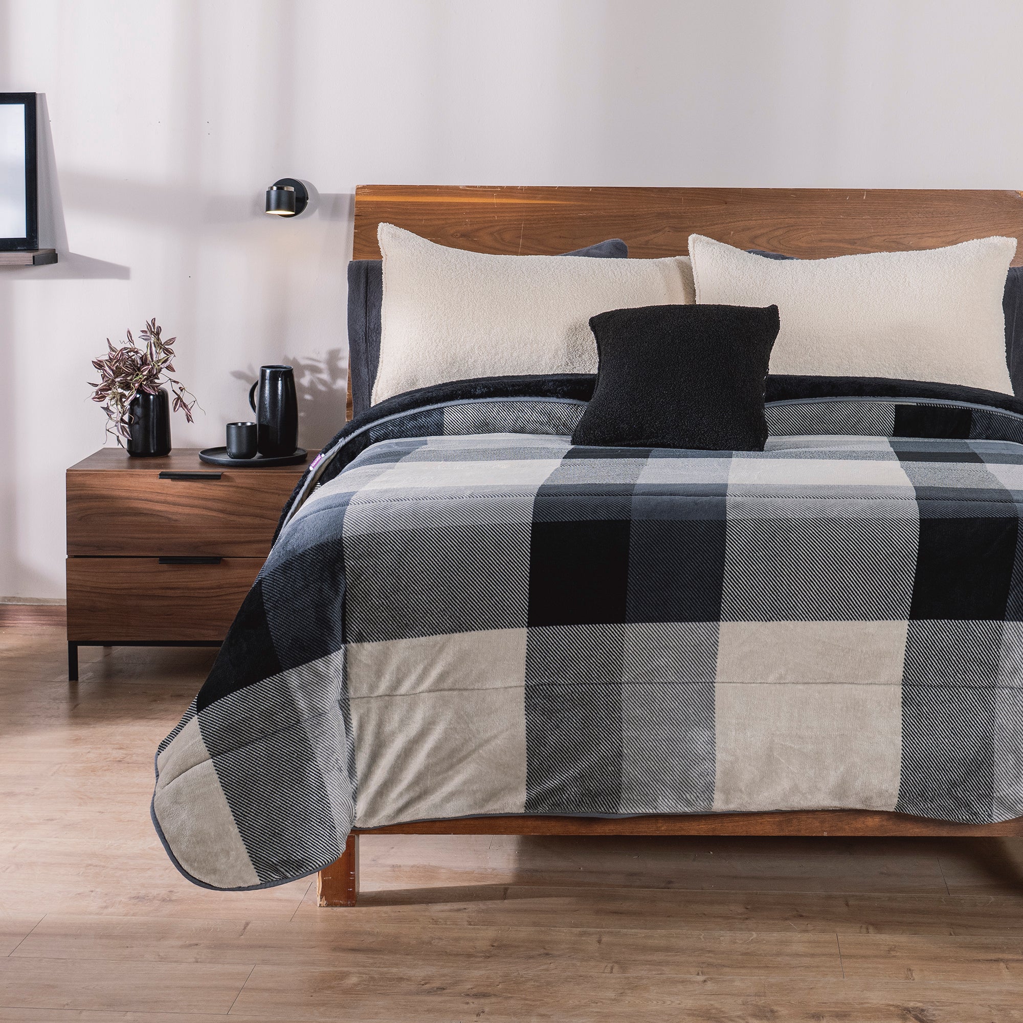 Cobertor invernal con primera vista de textura suave Beauty Soft y su segunda vista de borrega premium.