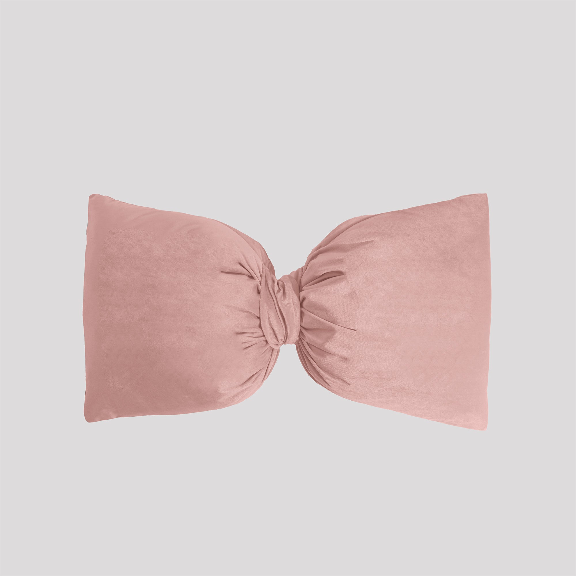 Cojín de figura, en forma de moño, con textura de terciopelo y en un color rosa que le dará un toque especial a tu habitación.