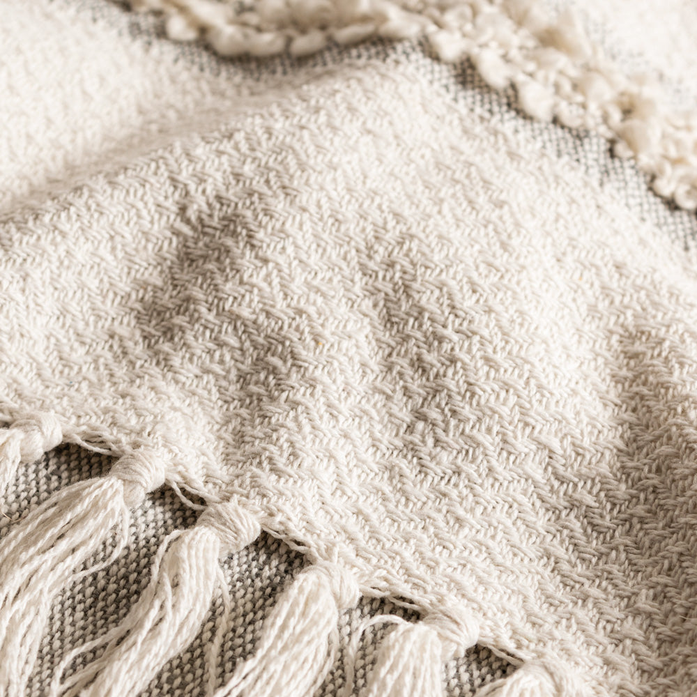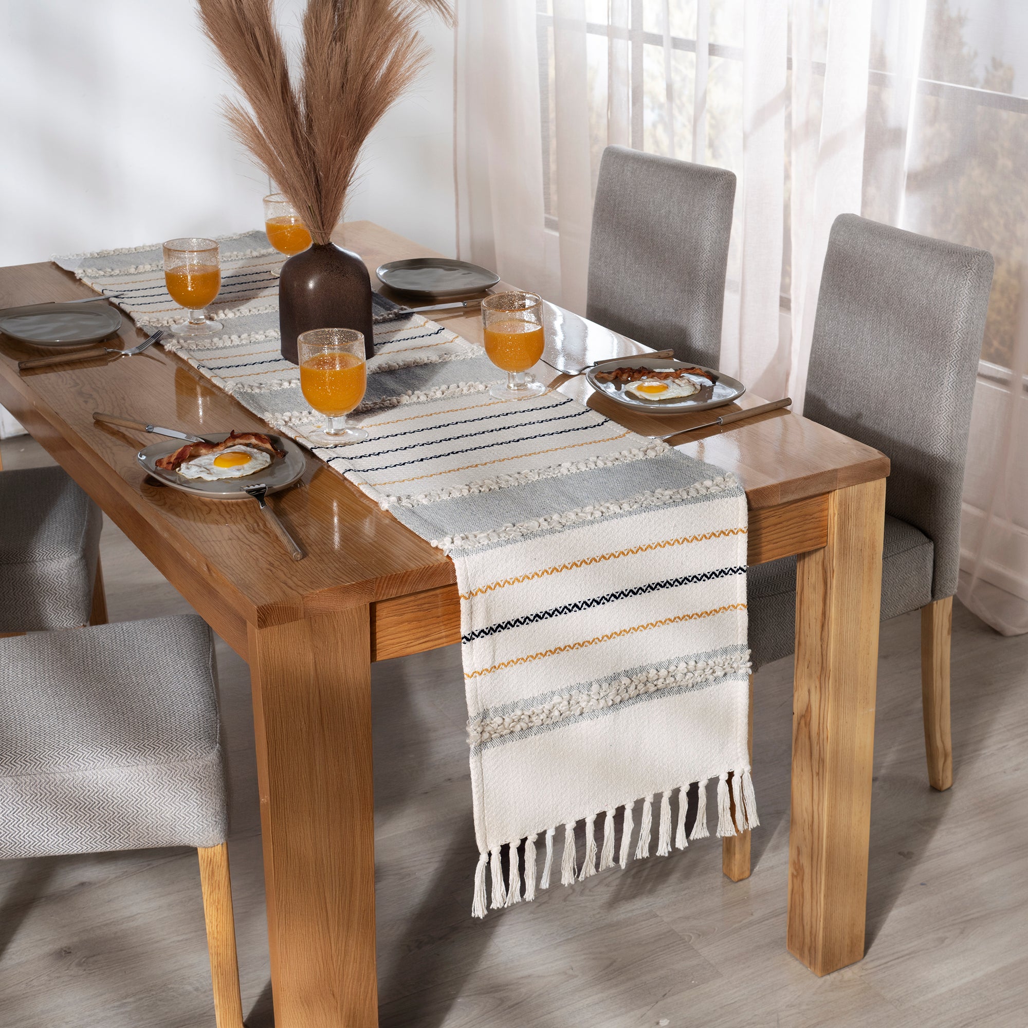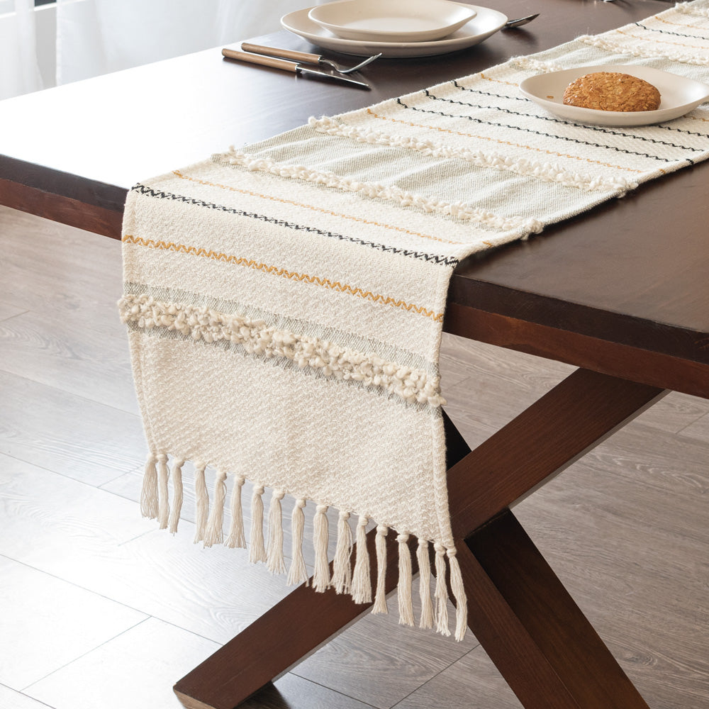Camino de mesa con diseño tejido 100% algodón con flecos, ideal para darle un toque decorativo a tu mesa.
