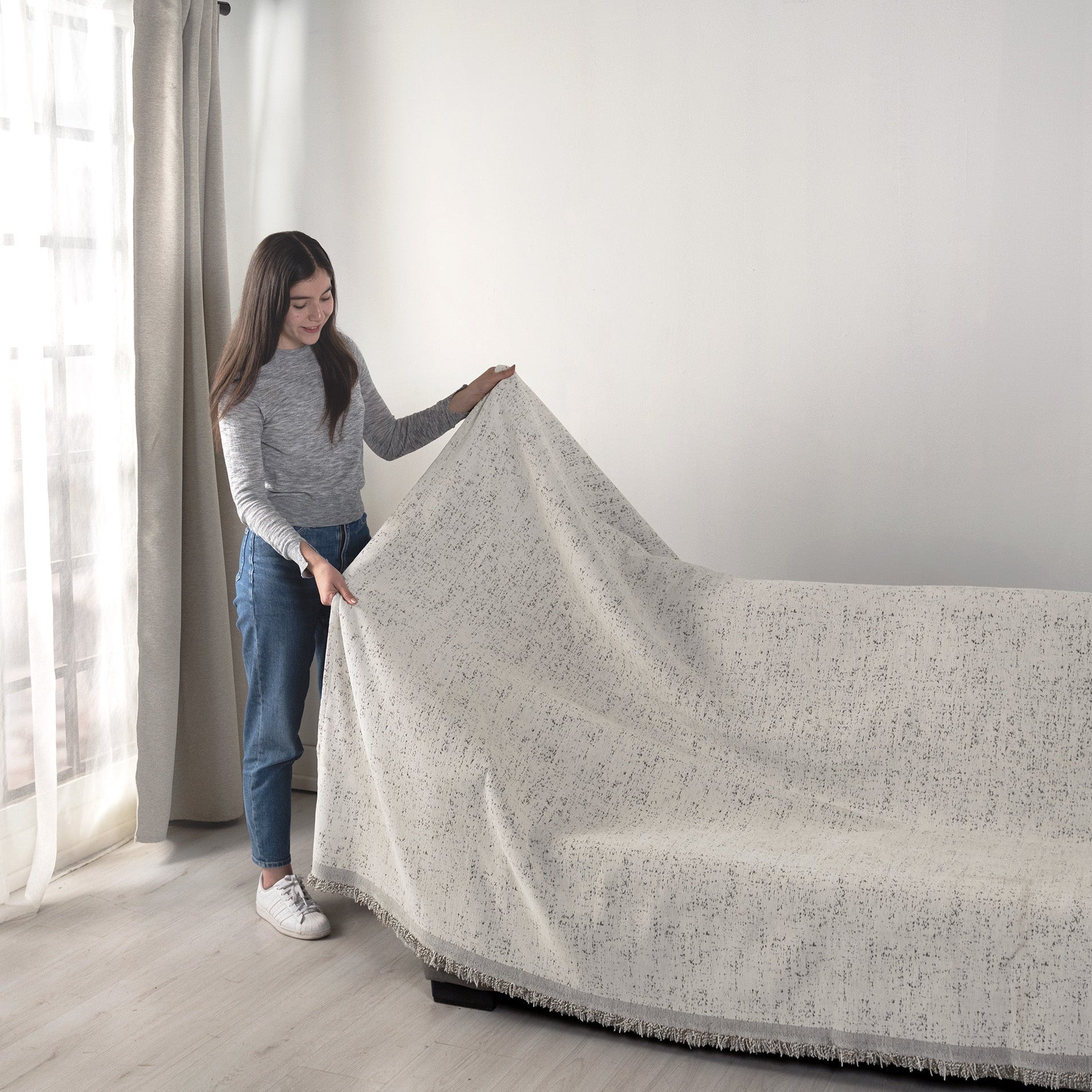 Renueva tu sala al instante con esta cubierta de suave textura chenille y elegantes flecos. Fácil de colocar y adaptable a cualquier sillón, solo extiéndela, ajusta las esquinas y alisa los pliegues para un look perfecto.